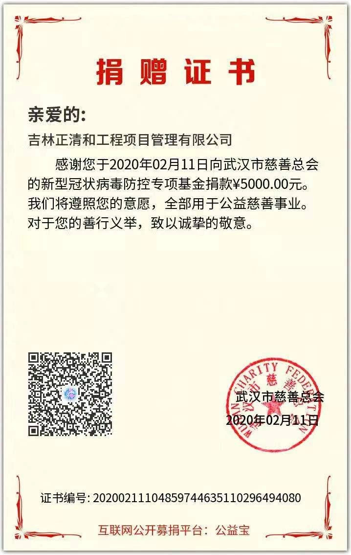 為進一步與全國人民共同做好“新型冠狀病毒感染肺炎”疫情防控工作,我公司秉承“善感恩、愛奉獻”的企業(yè)精神,勇擔社會責任,于2020年2月11日向武漢市慈善總會、吉林省慈善總會各捐款5000元,共計10000元,為疫情防控貢獻一份力量。
