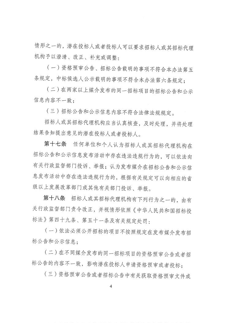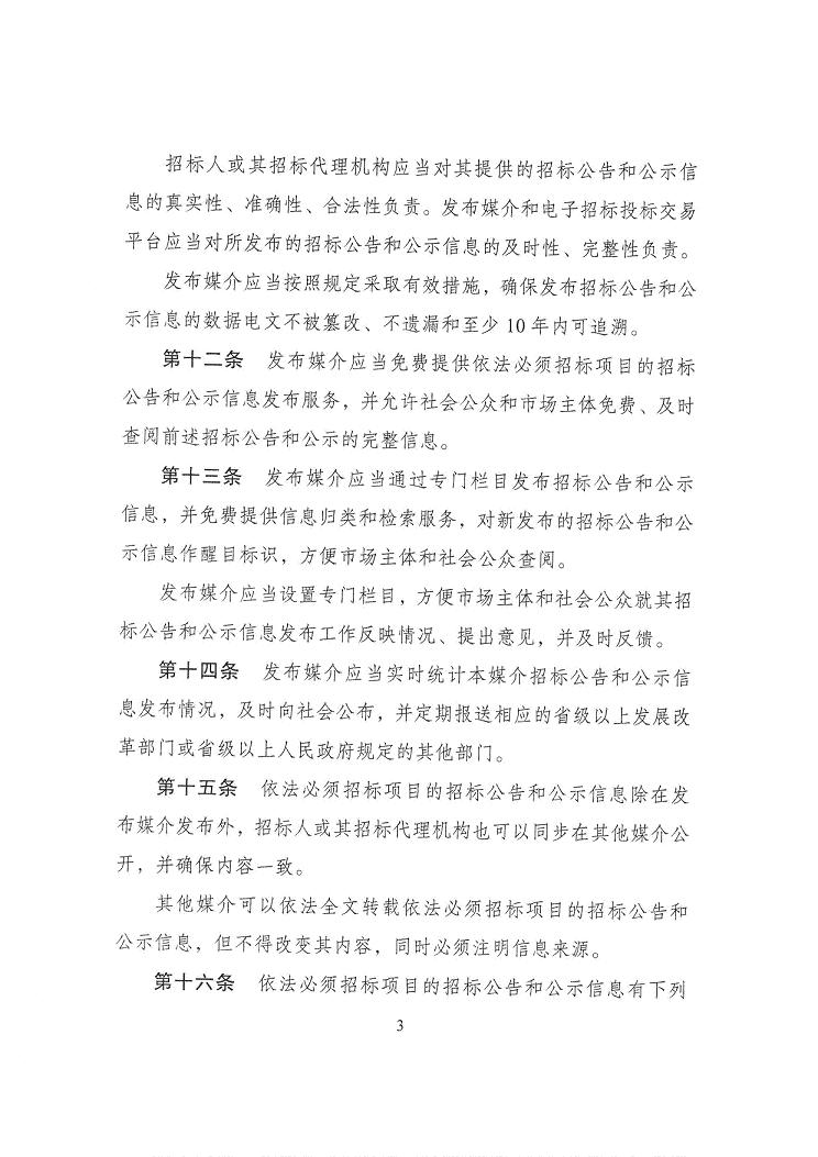 為規(guī)范招標(biāo)公告和公示信息發(fā)布活動(dòng),進(jìn)一步增強(qiáng)招標(biāo)投標(biāo)透明度,保障公平競(jìng)爭(zhēng)市場(chǎng)秩序,我們制定了《招標(biāo)公告和公示信息發(fā)布管理辦法》,現(xiàn)予印發(fā),自2018年1月1日起施行。
